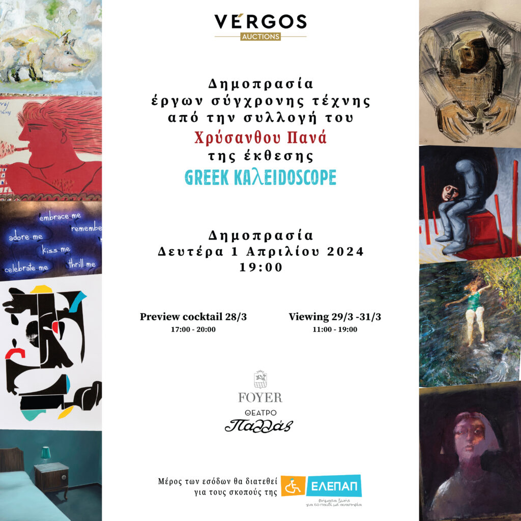 103 έργα σύγχρονης τέχνης επιλεγμένα από την προσωπική συλλογή του Χρύσανθου Πανά, τη Δευτέρα 1η Απριλίου και ώρα 7:00 μμ στο Foyer του Θεάτρου Παλλάς. Μέρος των εσόδων της δημοπρασίας θα διατεθούν για την υποστήριξη της ΕΛΕΠΑΠ, Ελληνική Εταιρία Προστασίας και Αποκαταστάσεως Αναπήρων Προσώπων, www.elepap.gr .