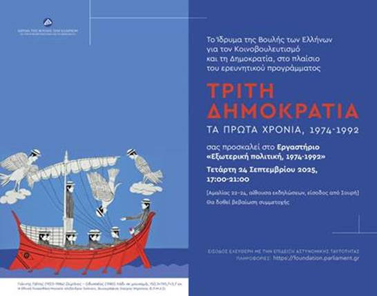 Το Εργαστήριο με τίτλο «Εξωτερική πολιτική, 1974-1992» θα πραγματοποιηθεί την Τετάρτη, 24 Σεπτεμβρίου 2025 και ώρα 17:00-21:00 στην αίθουσα εκδηλώσεων της Βουλής των Ελλήνων, Αμαλίας 22-24, είσοδος από την οδό Σουρή.