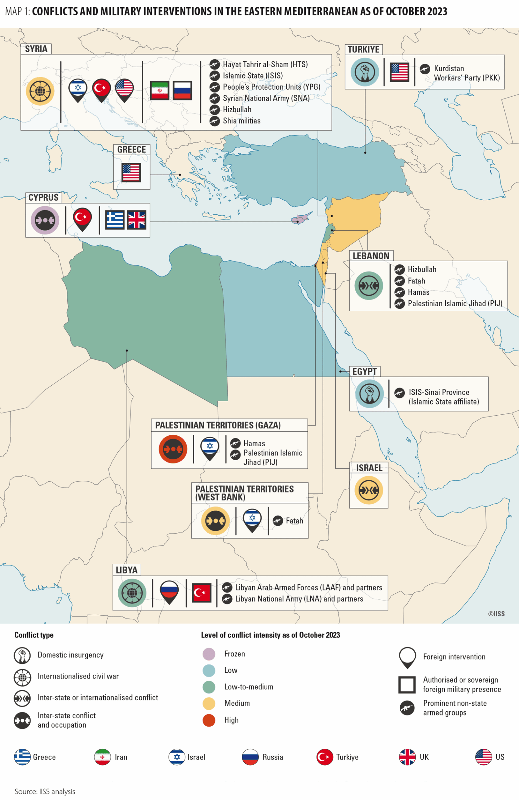 Η Κύπρος, αν και δεν εμπλέκεται άμεσα στρατιωτικά, βρίσκεται γεωγραφικά σε απόσταση επιχειρησιακής εμβέλειας από τη Μέση Ανατολή. Αυτό αυξάνει τον βαθμό επιφυλακής, ιδίως σε επίπεδο αεράμυνας και πολιτικής προστασίας.