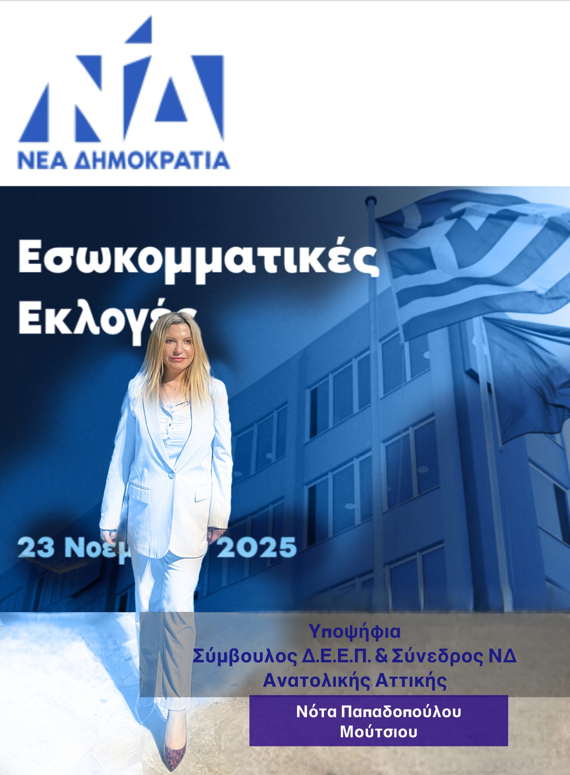 Στην πολιτική επικαιρότητα ενόψει και της εσωκομματικής διαδικασίας της Νέας Δημοκρατίας στις 23 Νοεμβρίου 2025, η Νότα Παπαδοπούλου Μούτσιου δηλώνει παρούσα, ως υποψήφια Σύμβουλος Διοικητικού Συμβουλίου της Δ.Ε.Ε.Π. και Σύνεδρος Ανατολικής Αττικής.