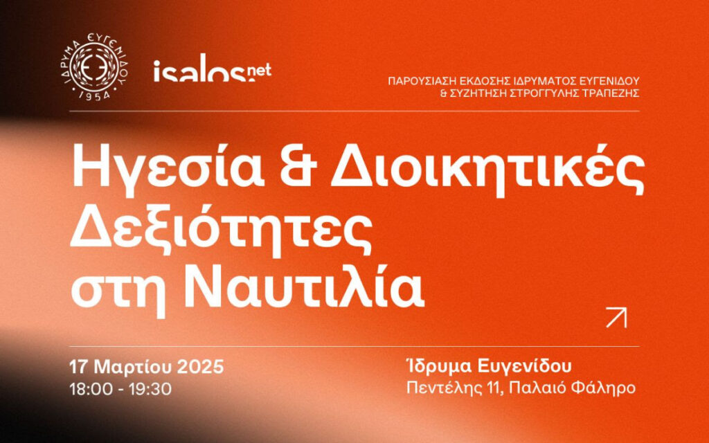 | Η πρώτη από τις επιμορφωτικές αυτές εκδηλώσεις με τίτλο «Ηγεσία και Διοικητικές Δεξιότητες στη Ναυτιλία», θα λάβει χώρα τη Δευτέρα 17 Μαρτίου 2025, στις 18:00, στο Αμφιθέατρο του Ιδρύματος Ευγενίδου, στο πλαίσιο της παρουσίασης της νέας εκπαιδευτικής έκδοσης του Ιδρύματος με τίτλο: «Ηγεσία, Διοικητικές Δεξιότητες και Διαχείριση Ανθρώπινου Δυναμικού».